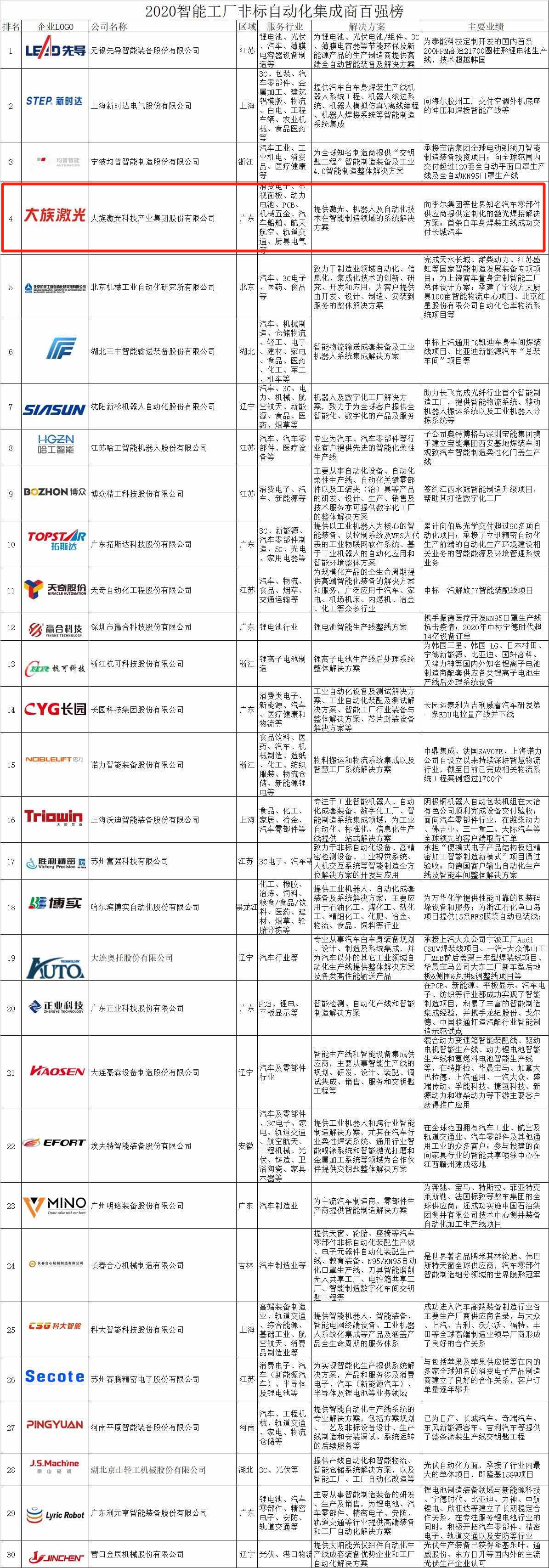 為了幫助廣大中國制造企業全方位了解我國智能制造領域優秀的非標自動化系統集成商所分布的區域、服務的行業、技術優勢和最佳實踐案例,選取能夠值得信賴,并提供滿足企業特定需求,切合行業特點的優秀系統集成商開展合作,從而進一步推動企業智能工廠建設,加快智能制造轉型步伐,e-works在調研分析了國內數百家智能工廠非標自動化系統集成商,搜集了眾多行業典型案例的基礎上,正式發布《2020中國智能工廠非標自動化集成商百強榜》。
