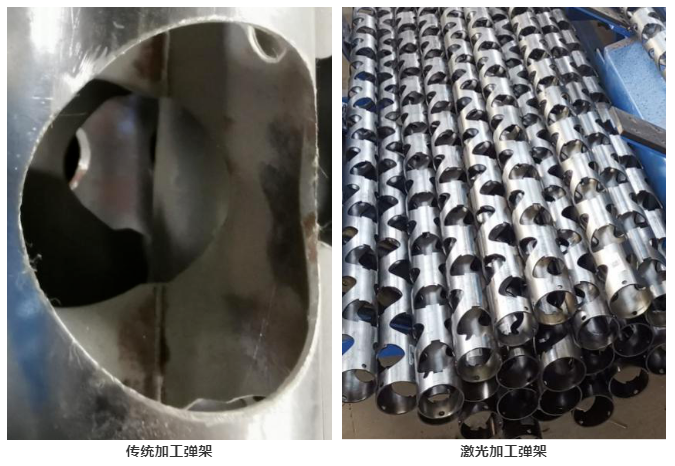 通過對激光器功率、氣流、系統及NC程序優化,生產線實現對彈架高效率、高質量斷面切割及嚴格的毛刺和掛渣控制。